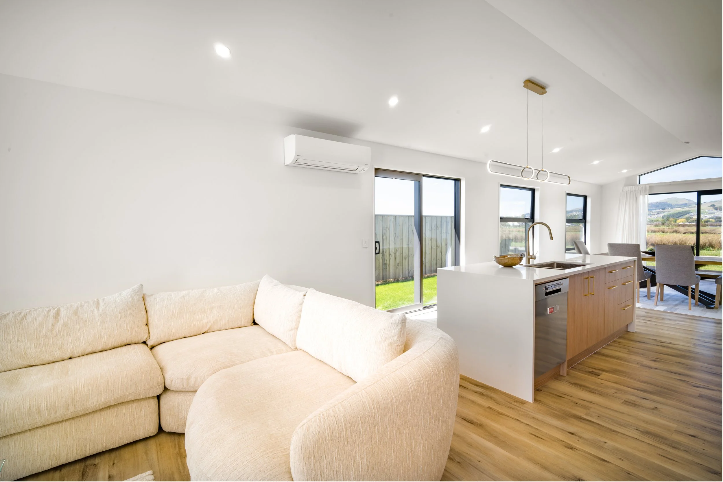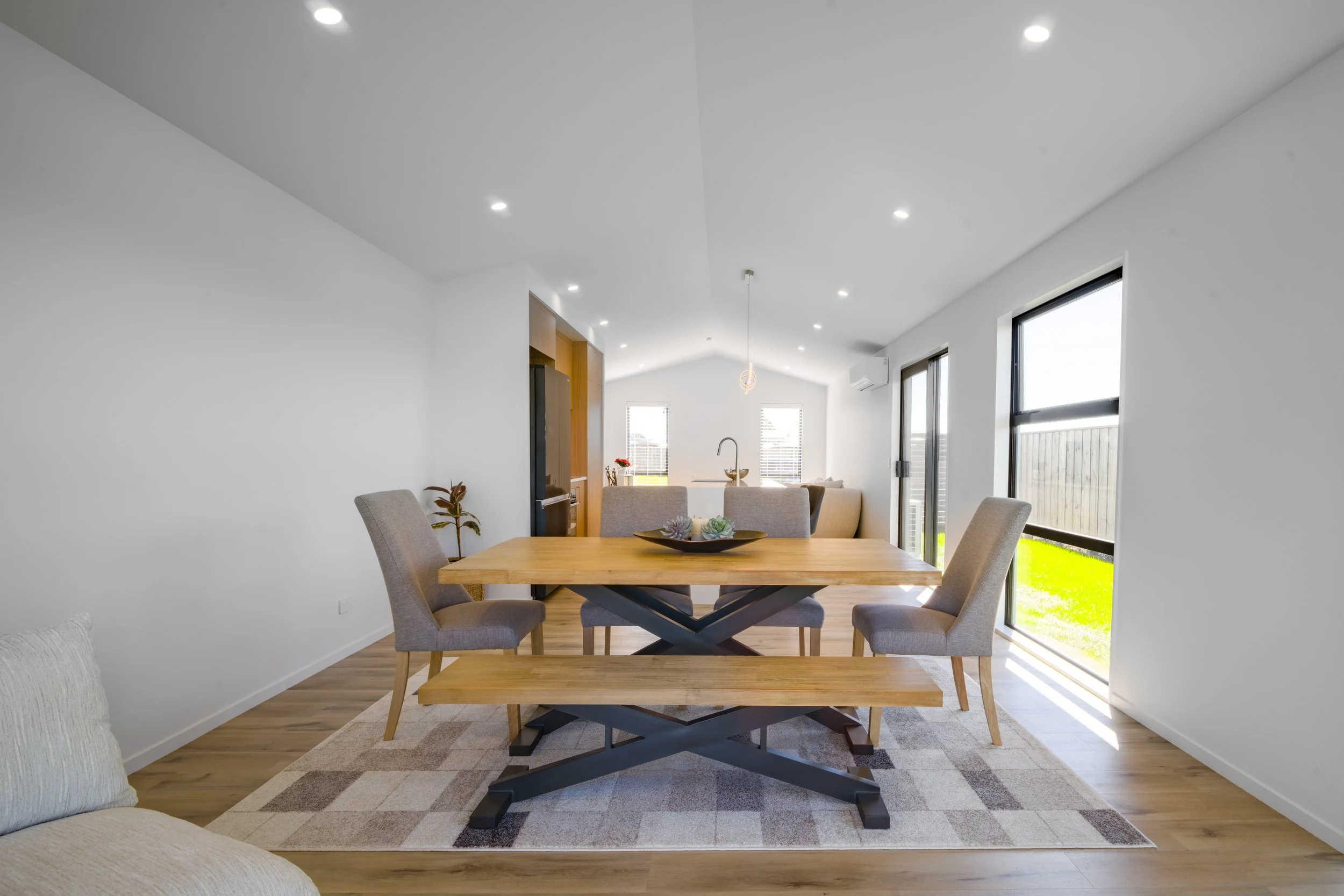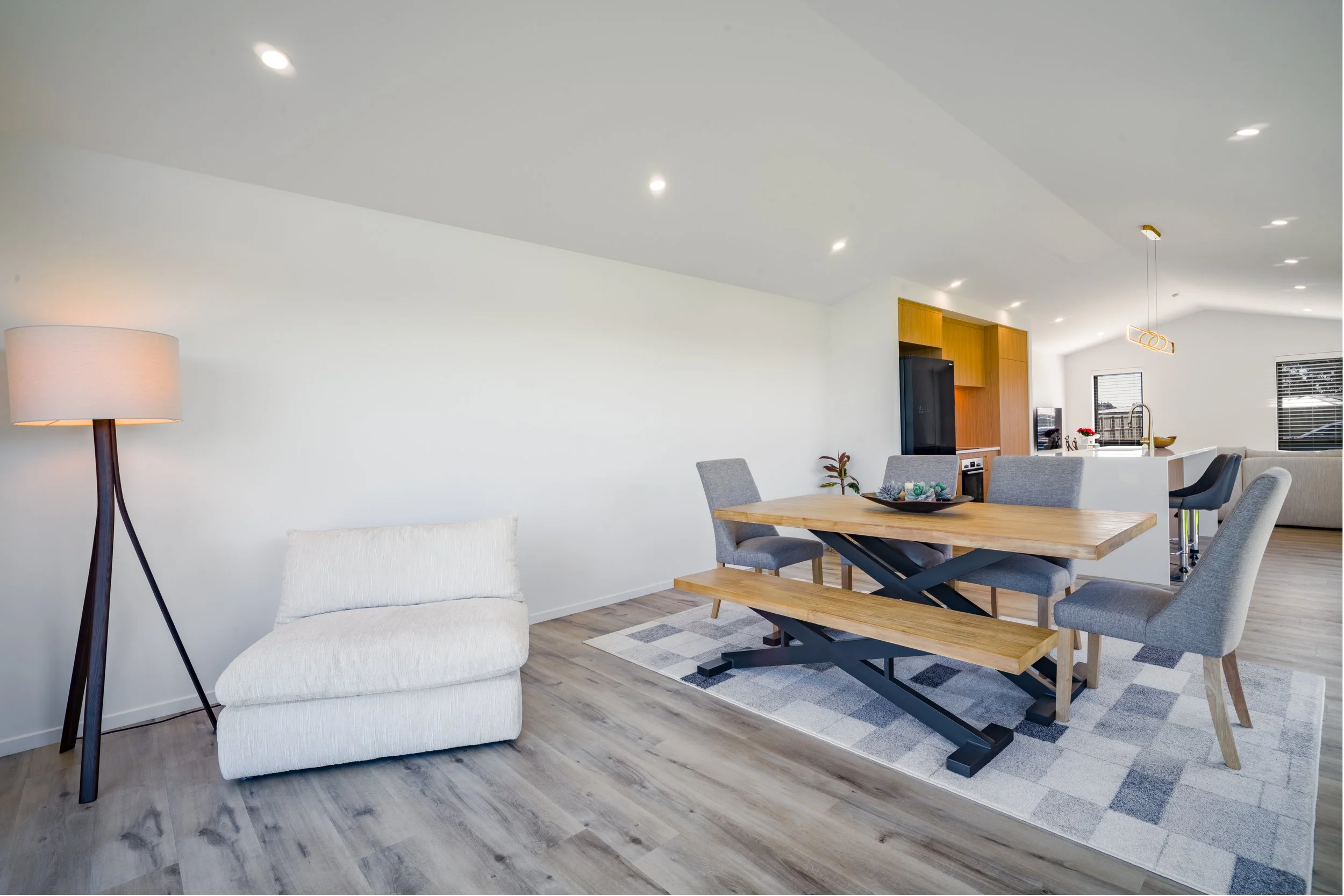 Inside, the home features a bright open-plan living, dining, and kitchen area that forms the heart of the house. Large windows and sliding doors allow natural light to fill the space while creating a seamless connection to the outdoor lawn — perfect for kids to play and families to relax together.