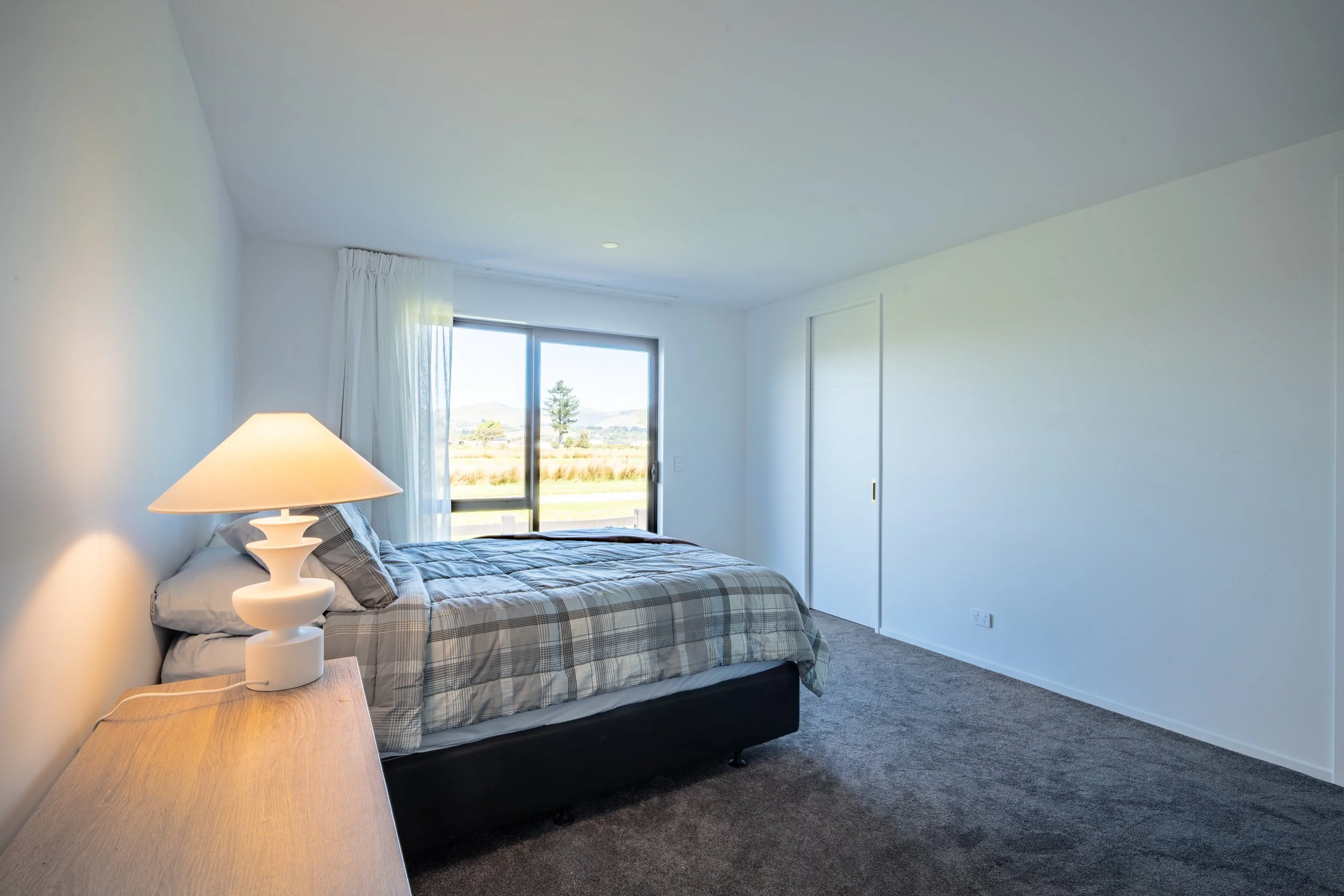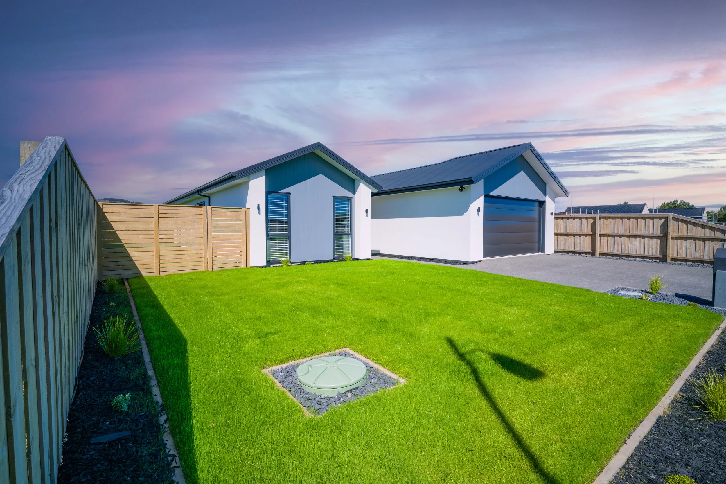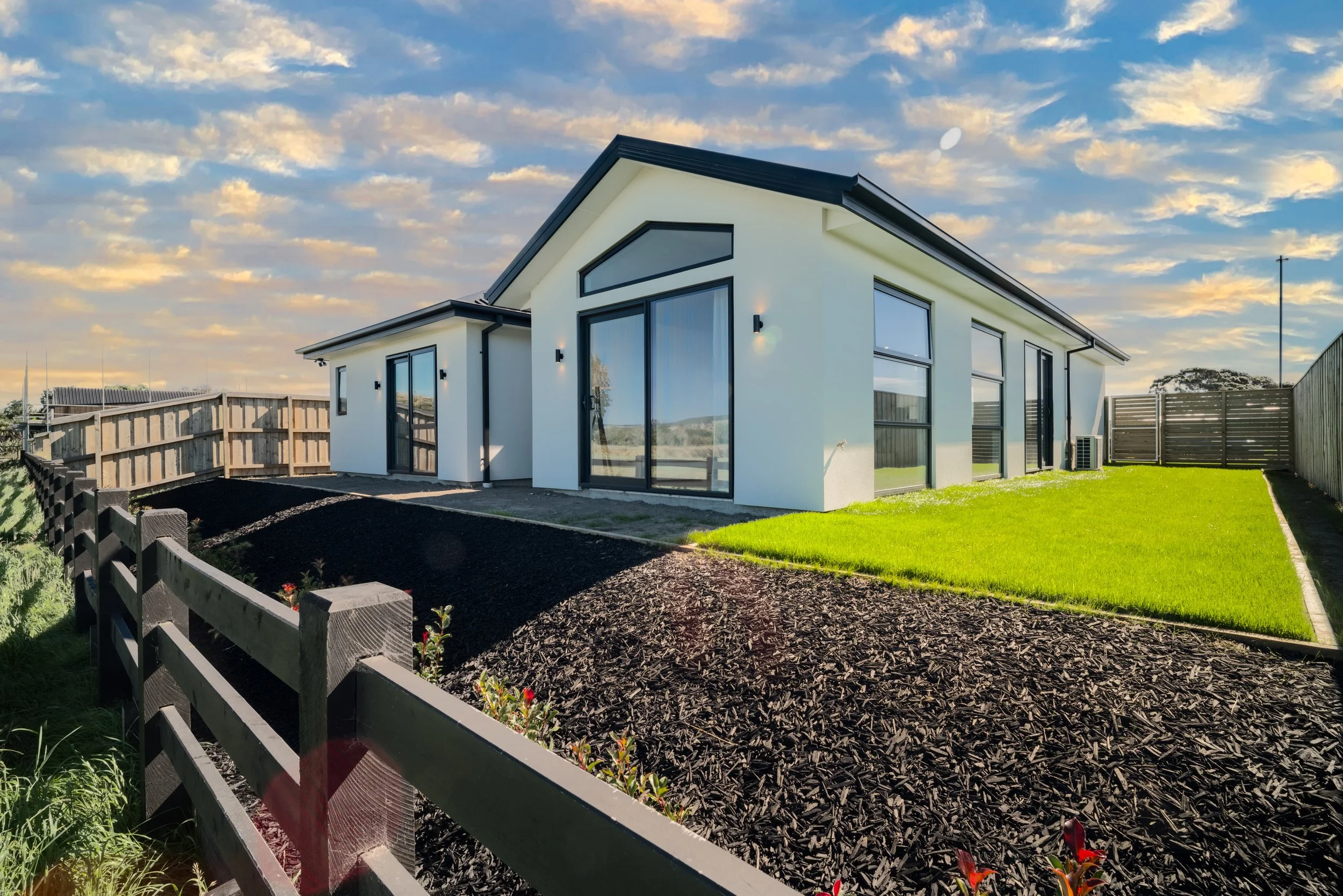 Inside, the home features a bright open-plan living, dining, and kitchen area that forms the heart of the house. Large windows and sliding doors allow natural light to fill the space while creating a seamless connection to the outdoor lawn — perfect for kids to play and families to relax together.