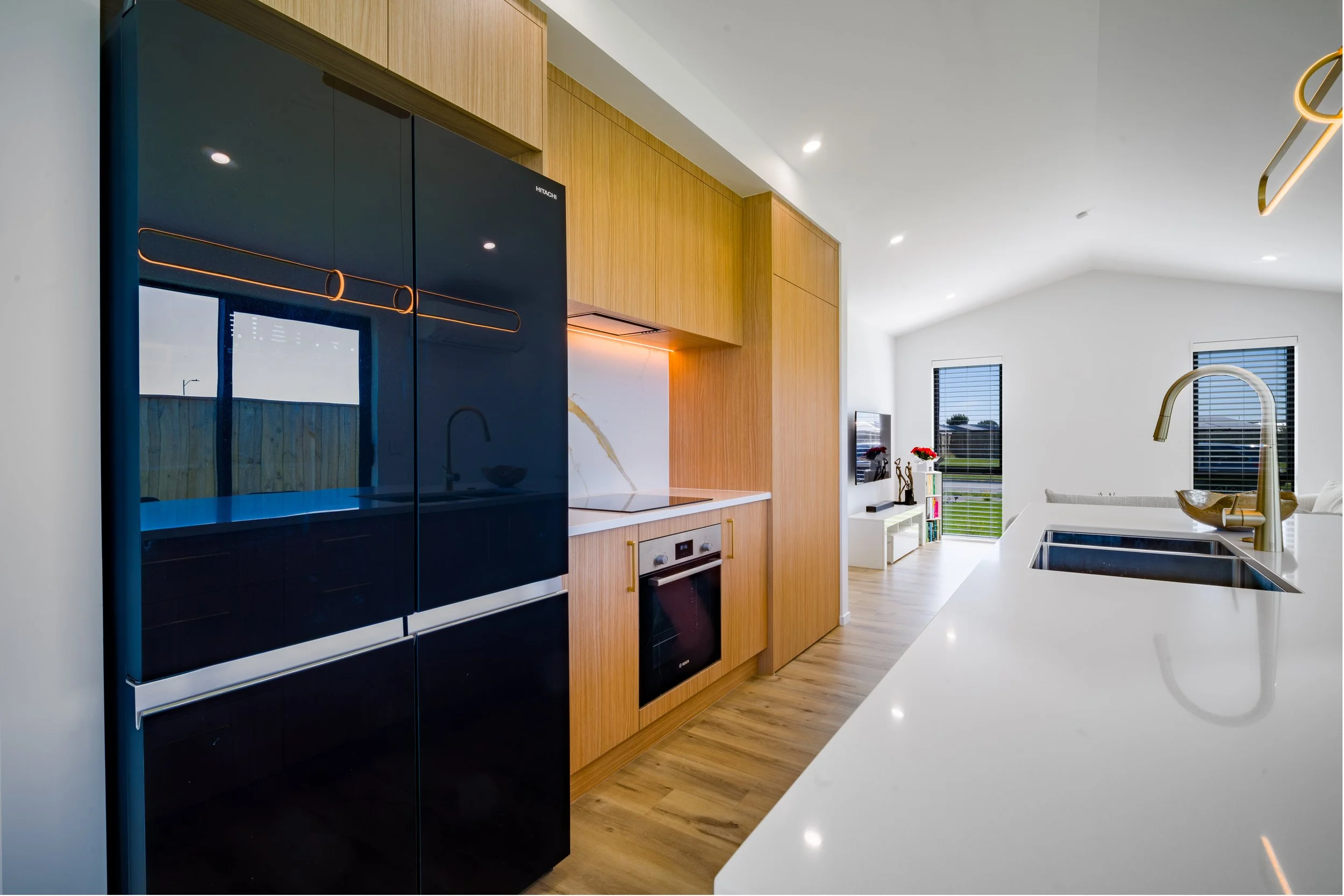 The modern kitchen with a large island bench is designed for both everyday cooking and entertaining. Warm timber cabinetry, integrated appliances, and elegant lighting create a stylish yet practical space where family meals and conversations naturally come together.