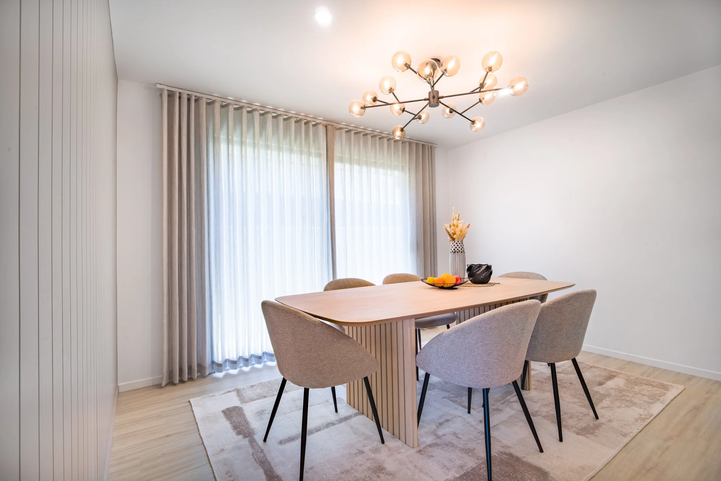 The interior features a bright open-plan living and dining area where large windows bring in natural light and create a welcoming atmosphere for family gatherings and relaxing evenings. Soft neutral finishes and modern lighting give the space a calm and contemporary feel.