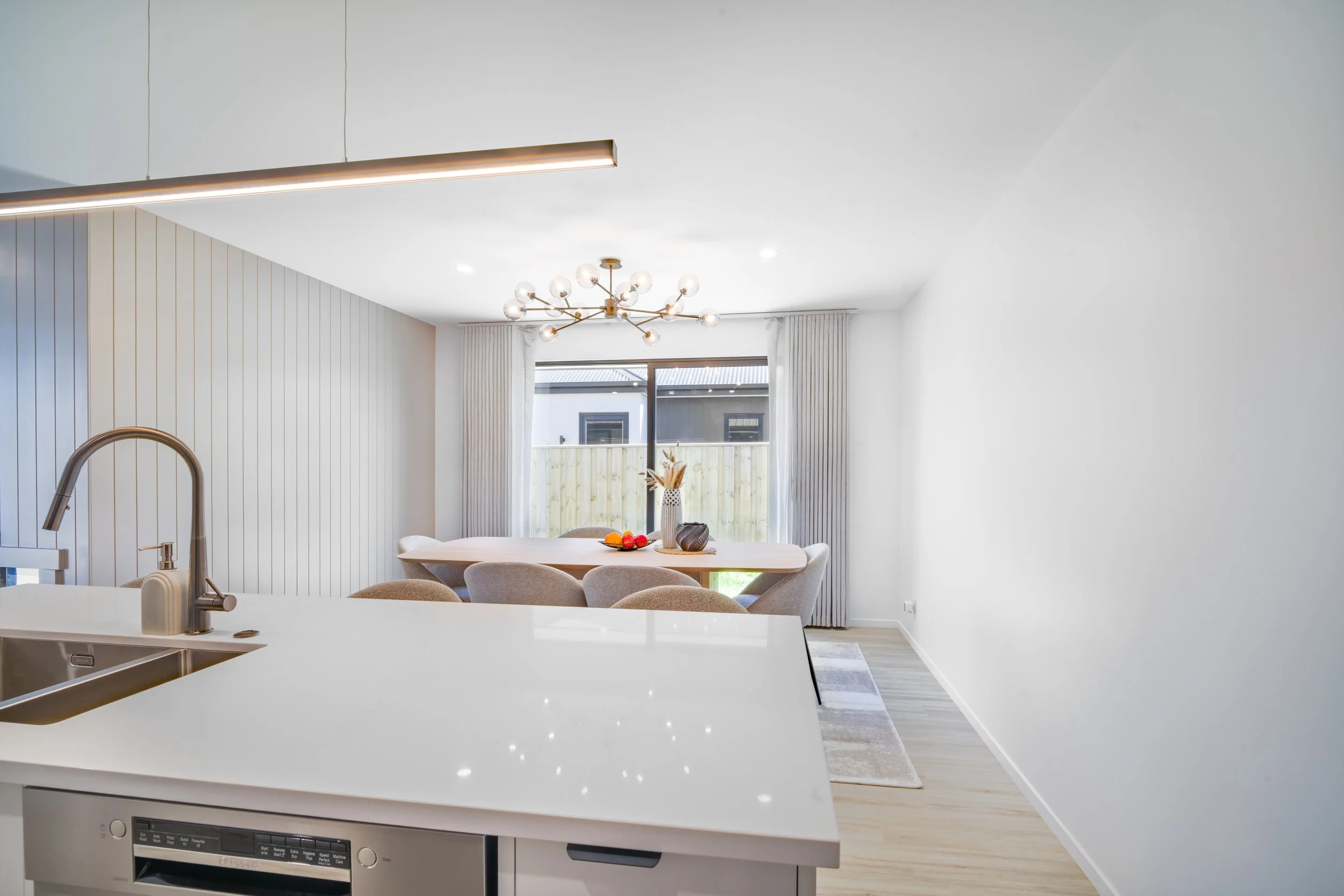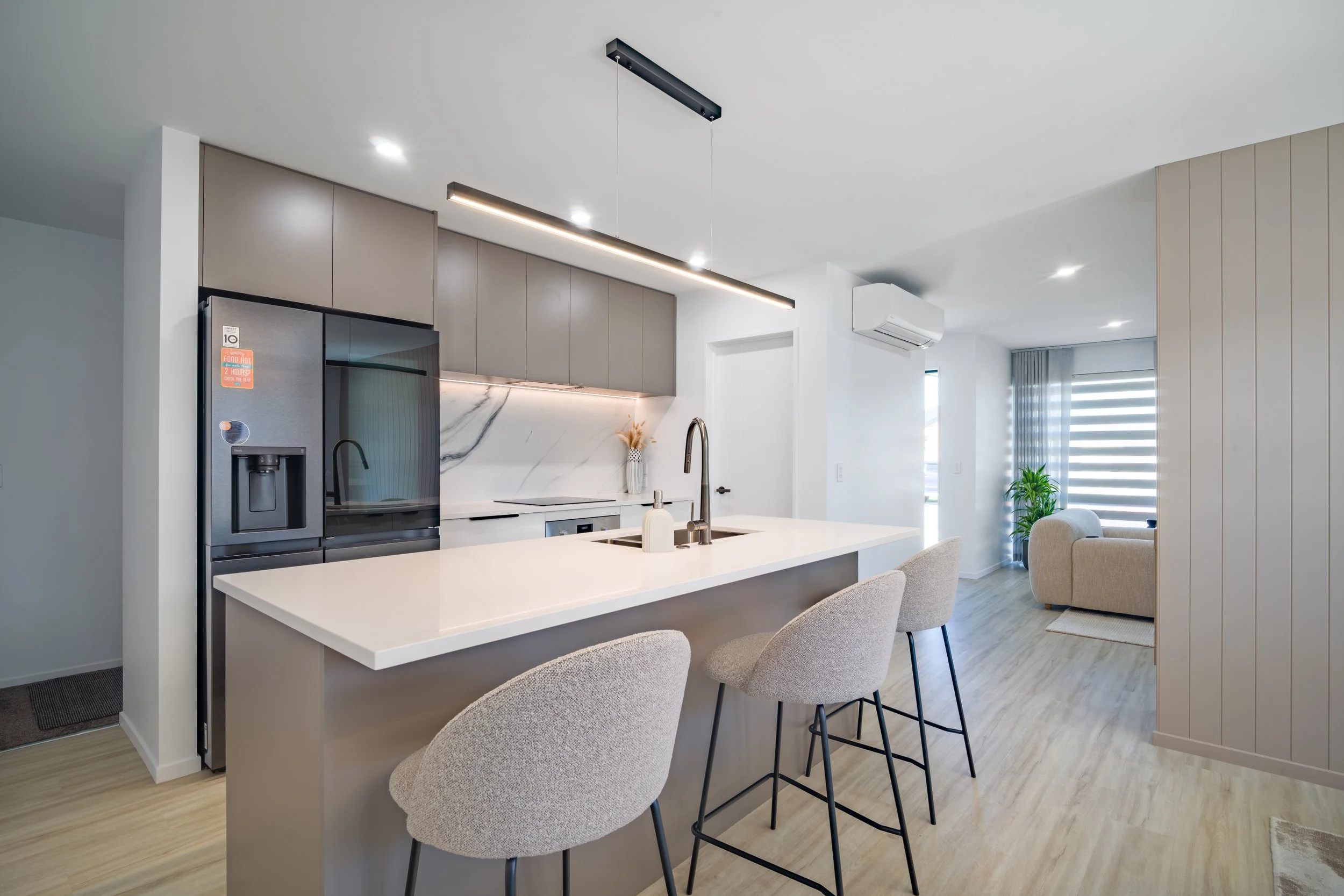 At the heart of the home is a sleek modern kitchen with a spacious island, designed for both everyday living and entertaining. The seamless flow between the kitchen, dining, and living areas allows families to stay connected while cooking, dining, and spending time together.